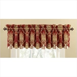 This traditional woven jacquard window valance by Waverly adds a beautiful touch to any home. This 80-inch W by 15-inch L double scallop window valance is embellished with rich golden floral bouquets on a deep merlot ground. Complimenting stripe accents and covered button details complete the look. Perfect for kitchen, bedroom, living room or bath.